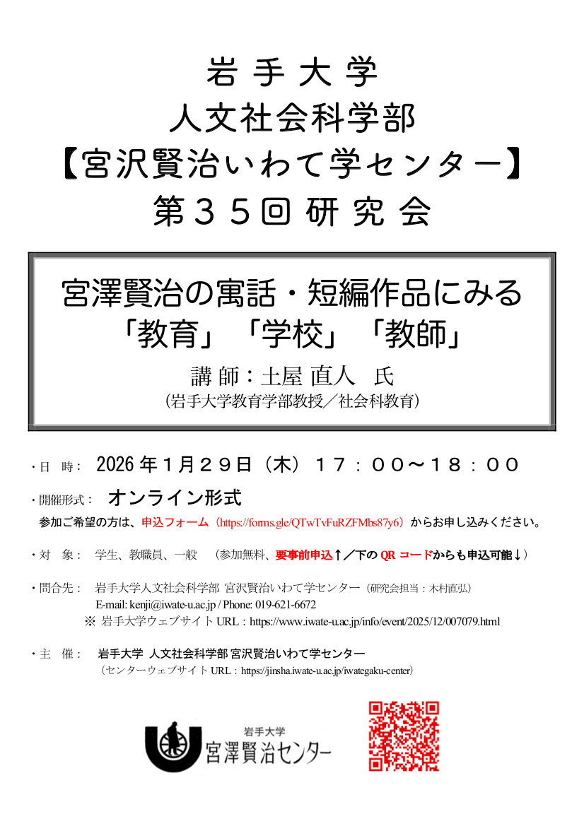 岩手大学人文社会科学部 宮沢賢治いわて学センター 第35回研究会(=旧・岩手大学宮澤賢治センター第140回定例研究会)(2026.1.29)
