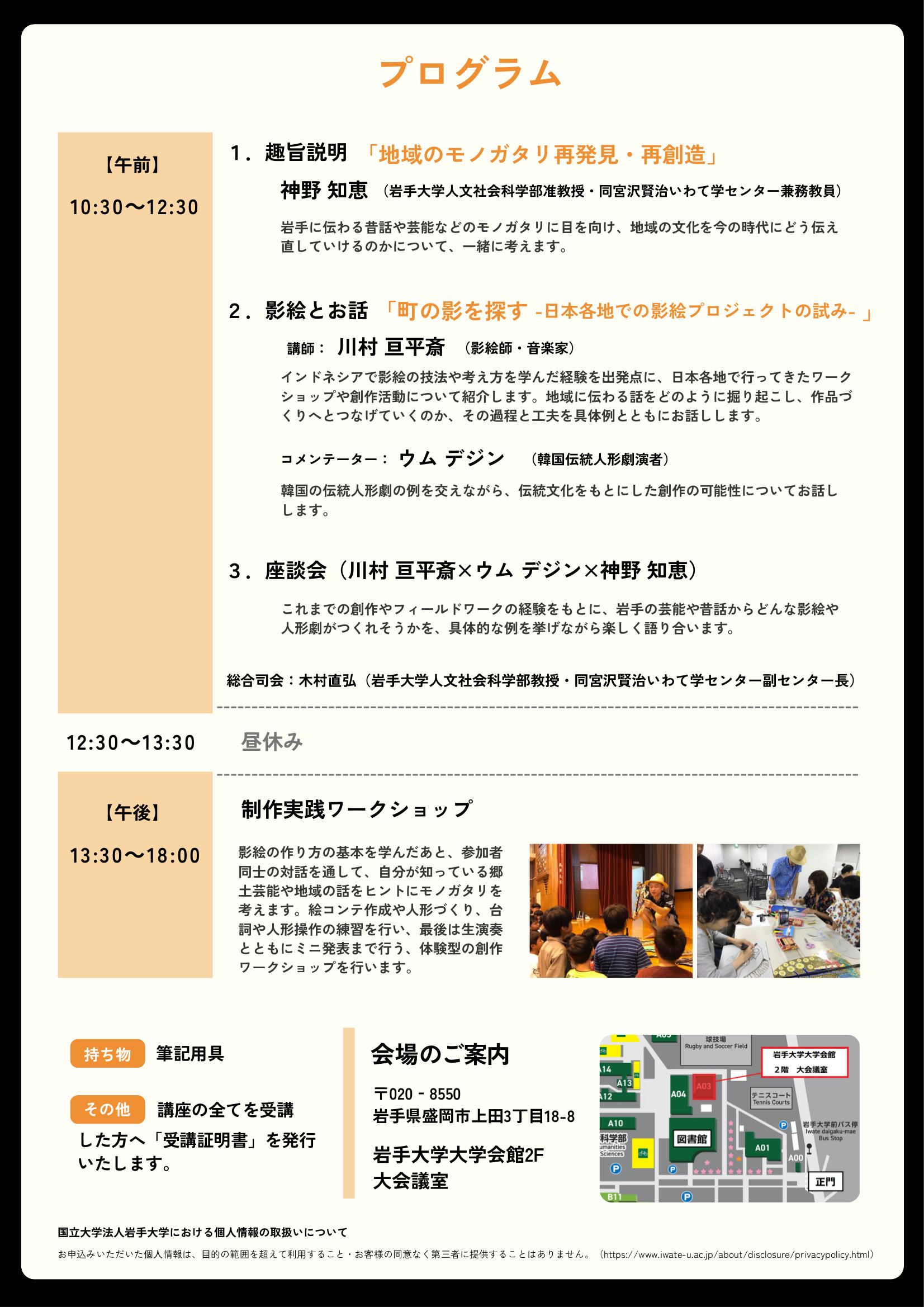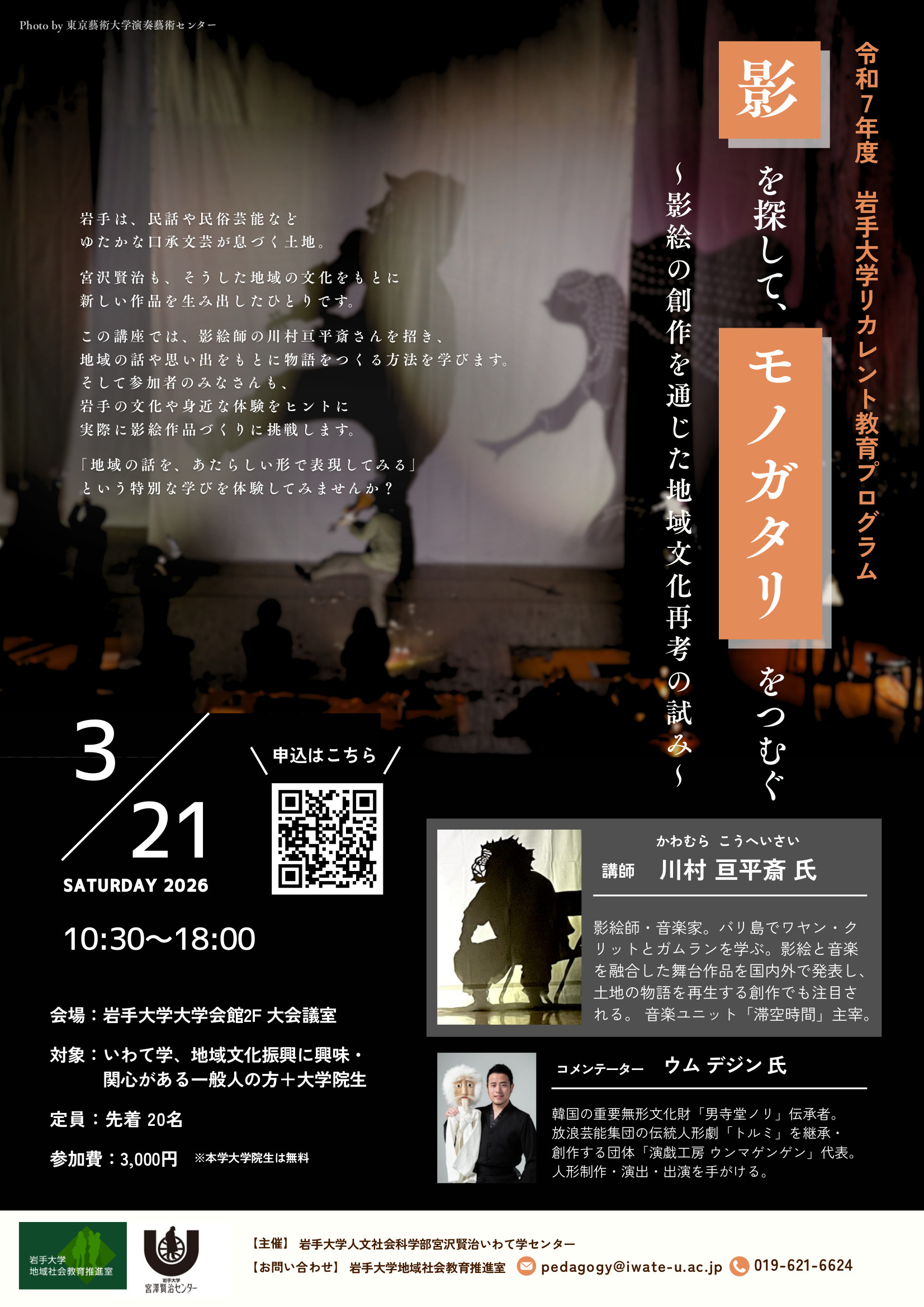 ・名 称: 令和7年度岩手大学リカレント教育プログラム「影を探して、モノガタリをつむぐ〜影絵の創作を通じた地域文化再考の試み~」